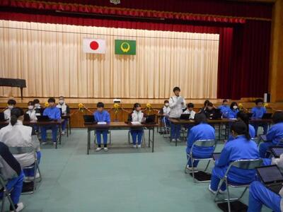 生徒総会のあと、3年生を送る会が行われました。実行委員長のあいさつからスタートです!
