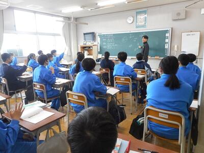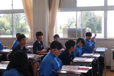 ・2年2組は国語です。「未来へ」の詩の中にこんな文があります。「足元の土に生と死が埋もれている」・・・「死」が埋もれているのは分かりやすいですが、「生」が埋もれているとはどういうことなのだろう?みんなで考えていました。