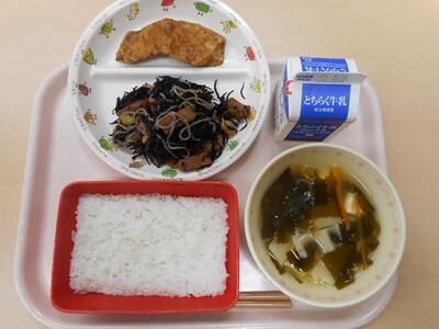 今日の給食は「ごはん・牛乳・モロの揚げ煮・ひじきの煮物・若竹汁」です。