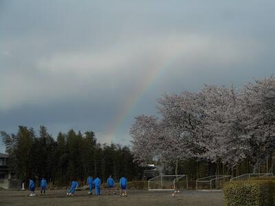今日も1年生が部活動見学をしています。今日は集団ではなく小グループでの見学をしているようです。サッカーの見学に来た1年生がボールを蹴っています。なんとその奥には虹が出ていました。