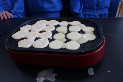 2年生の理科で面白い実験をすると山口先生に聞いて、1時間目の2年1組の授業に行ってみました。化学変化の実験です。小麦粉100gと水120g、たまご1個を混ぜます。そこに重曹を入れたものと入れないものに分けてたこ焼き器で焼いていきます。