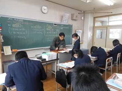 ・3年1組は数学です。第1章に入りました。今日は「展開」の学習です。問題を解き終わったら、加藤先生・大塚先生・室井先生に見てもらいます。
