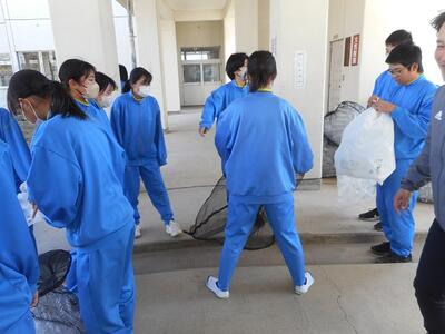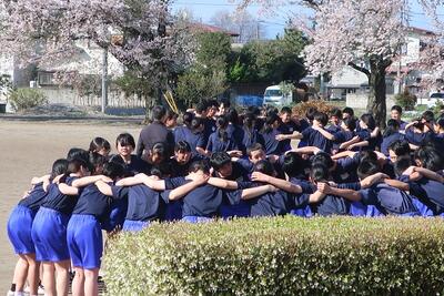 ・3年2組は体育で100m走です。校庭の満開の桜の下からスタート!新体力テスト優秀校の本校、生徒のみなさん、自己ベスト目指して今年もがんばってください。