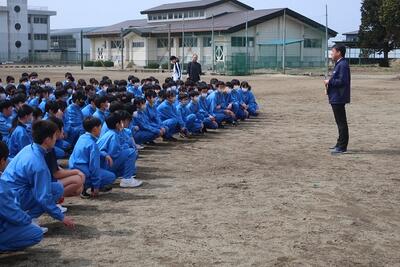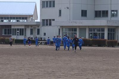3分後、給食室から火災発生の通報があり、全員が校庭に避難します。校庭に出たら全速力!