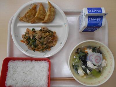 今日の給食は「ごはん・牛乳・県産豚肉にら入り餃子(3個)・豚キムチ炒め・中華スープ」です。