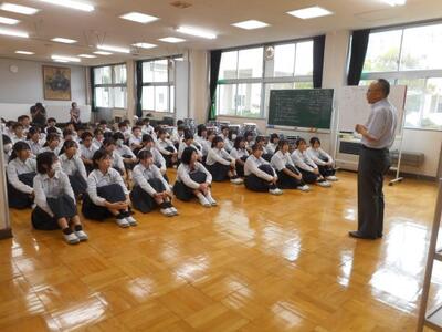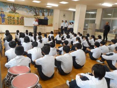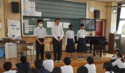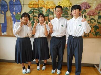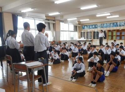 朝の活動の時間には、1年生が音楽室で、3年生が食堂で学年集会を行っていました。前期の学年委員があいさつをし、生徒からは大きな拍手がありました。
