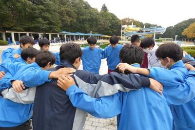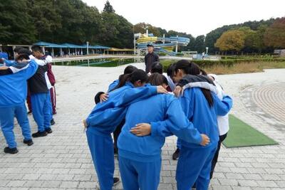 生徒たちはみんな元気です。円陣を組み、気合いを入れます!