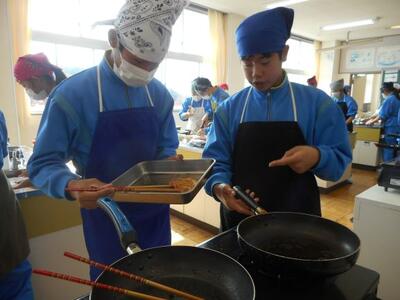 ・1組は家庭科で調理実習です。昨日2組でもやっていた「豚肉のしょうが焼き」です。