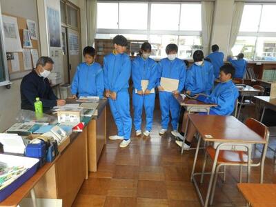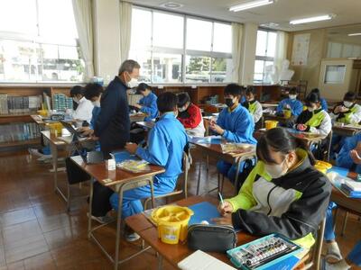 ・3時間目は1年1組が美術です。こちらも版画です。下絵が描けた生徒は藤田先生に見てもらい、マジックでなぞっていきます。