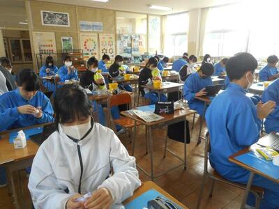 ・1時間目、2年1組は美術で、ハロウインランタンを製作中です。紙粘土をこねこねしている生徒がたくさんいます。粘土に絵の具で赤や緑、黄色、黒などなど色を付けていますね。赤と白と緑は雪だるまでしょうか~