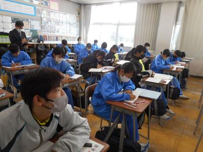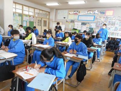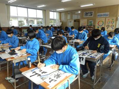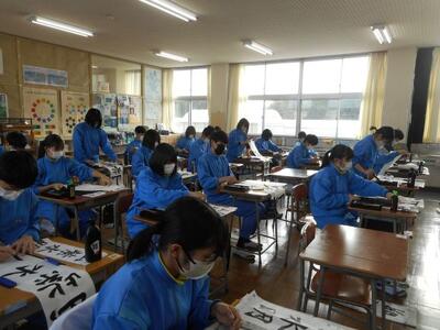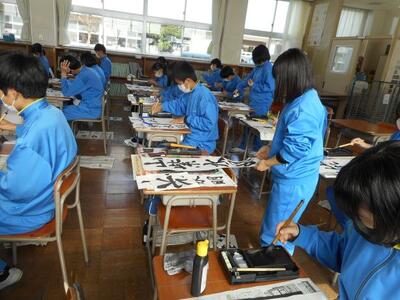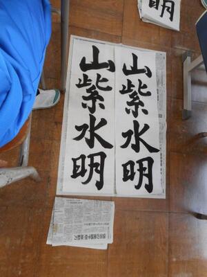 ・3時間目、3年1組は国語です。美術室で書初展に出す「山紫水明」を書いていました。昨日2組が書いていたものですね。美術室前の廊下まで墨のいい香りがしています。着席して書いている子、立って書いている子がいます。