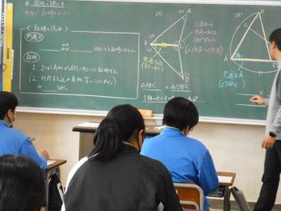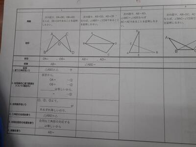 ・2年2組は数学です。「三角形の合同の証明を書こう!」がめあてです。
