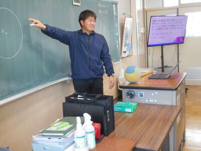 ・6時間目、1年1組は数学です。円に入りました。めあては「円とおうぎ形・接線についてわかる」です。教卓にバレーボールが乗っています。このあとの学習に使うようですよ。まずは小学校の復習、円の面積と周の長さの公式を確認しています。
