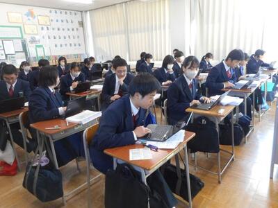 ・2年1組は国語で「年賀状を完成させよう」です。越沼先生のチェックを受けて、約半数の生徒が完成しています。自分で投函するそうですよ。