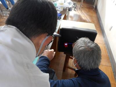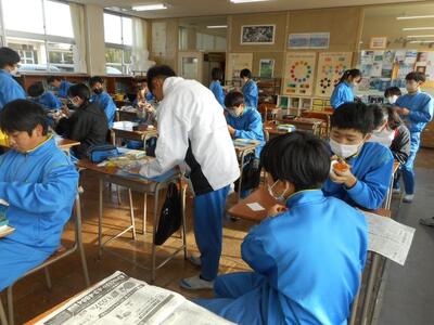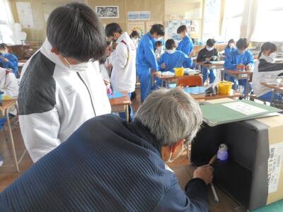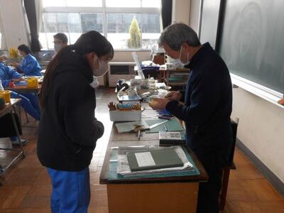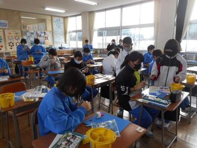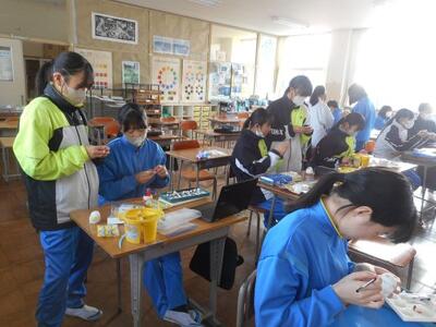 1時間目、2年1組は美術です。ランタンが完成しそうです。完成した生徒はライトを付けてみています。発光がキレイでいい感じです。