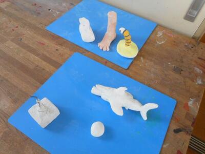 ・2時間目は2年2組が美術でした。こちらも工夫いっぱいの作品がずらり。