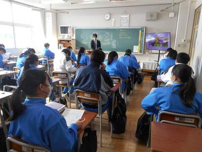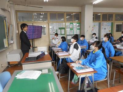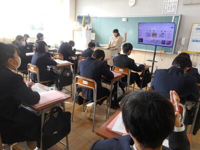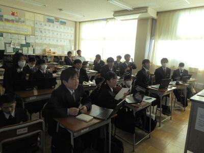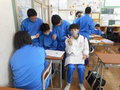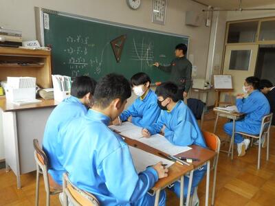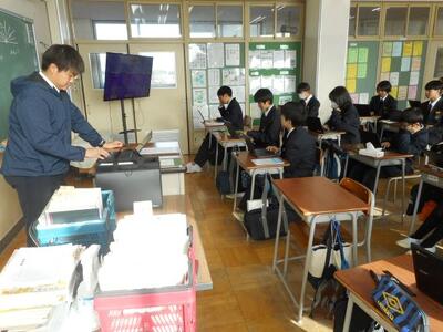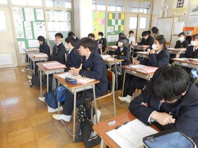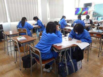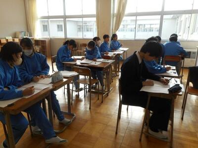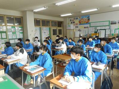 ・3年2組は数学です。私立高校の過去問の解説と教え合いです。みんないい雰囲気で学習に取り組んでいますね。冬休み中から始まる私立高校の受験・・・3年生のみなさん、体調をしっかり管理して、入試を迎えられるようにしてくださいね。