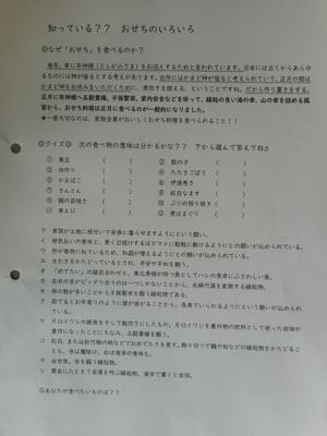 生徒たちは「かまぼこ」や「きんとん」「数の子」「伊達巻き」は良く知っているようですが、「紅白なます」や「たたきごぼう」はあまり知らないようでした。お正月はおせち料理の意味を知って食べると、また味わいが違ってくるのかもしれませんね。
