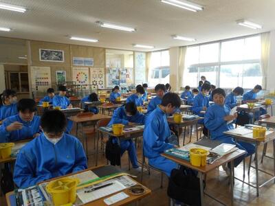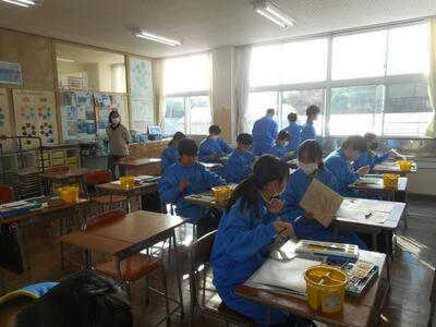 ・1時間目、1年2組は美術です。一版多色木版画を制作しています。刷りの注意点は4つ①絵の具の濃さ ②版に色を付けるときの量 ③刷り紙をおく時 ④こする時・・・だそうです。