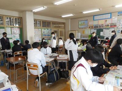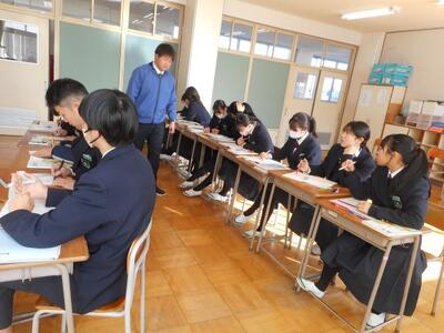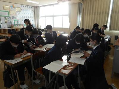 ・2年1組は社会です。「東北地方の自然環境の特色」を学習しています。東北出身の田母神先生が「東北のイメージは?」と聞くと「魚が美味しい」「果物が豊富」「伝統的なお祭りが多い」「1つ1つの県が大きい」等が出てきました。東北の人たちがお祭りを盛大に行う理由があるそうです。何だと思いますか?生徒たちに聞いてみてください。
