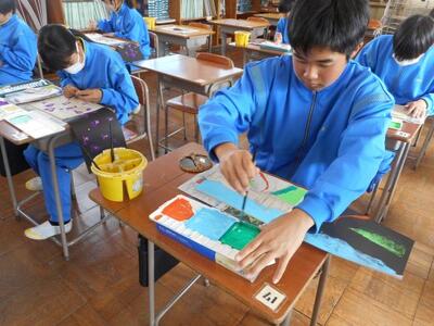 ・1年1組は美術で、一版多色木版画を制作しています。色づけが進んでいる生徒が多いですね。きれいに色が出ています。