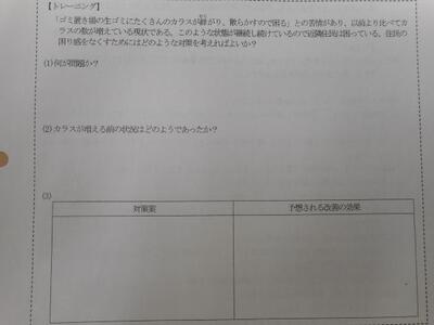 ・3年1組は理科です。「自然と人間」を学習しています。プリントの【トレーニング】の内容をグループで話し合っています。どんな対策を考えたのかな?