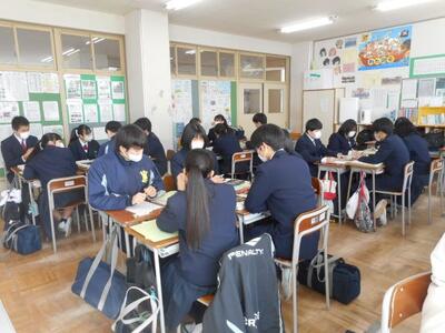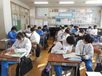・2年2組は数学です。証明問題の書き方を友達と確認しています。このあと「特別な平行四辺形の性質」の学習に入ります。2年生、証明を書くことがとっても上手です!繰り返し学習の成果ですね。