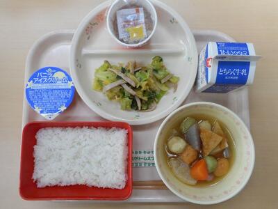 今日の給食は「ごはん・牛乳・納豆・ごまサラダ・カラフルおでん・バニラアイス」です。