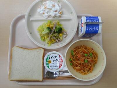 今日の給食は「食パン・牛乳・スパゲティボロネーゼ・イタリアンサラダ・パンナコッタ風デザート・フルーツあえ」です。