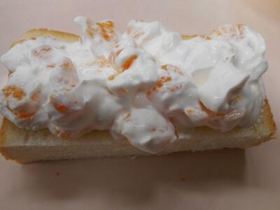 パンナコッタ風デザートにフルーツあえ!今日はデザートが2つあるみたいで嬉しいです。ふわふわな食パンは厚めにカット!甘すぎないクリームとベストマッチです。