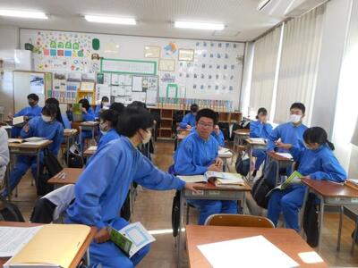 ・3年2組は国語です。授業の初め、「読む力」を使いこなすための「読み方レスキュー」に取り組んでいます。カーネルサンダースの話がでてきました。生徒同士で答えの確認中です。