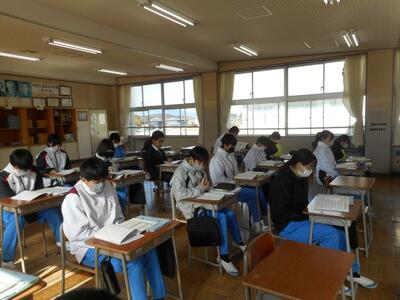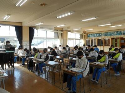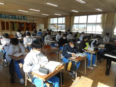 ・2年2組は音楽です。今日は前半が「鑑賞」の授業、後半が「オーケストラの楽器」について学びます。立志を迎えた2年生、今日は「14~fourteen~」を鑑賞しています。
