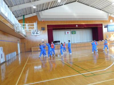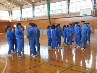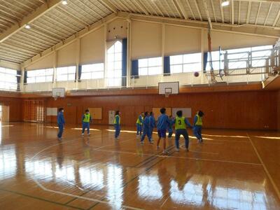 ・3年1組は体育です。バスケットボールです。今日は6分間×3試合を行います。①女子のみシュート可 ②ドリブル禁止 ③縛り無しのフリー の3試合だそうです。まずは誰がどの試合に出るかを話し合いで決めています。