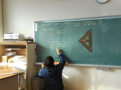 ・2組は数学です。大塚先生のクラスは作図の入試対策に取り組んでいます。大塚先生がポイントを確認しています。「最初にやること⇒どこに(○○上になど)、何を作図(点・線分・図形)するかイメージをもつこと」ですね!