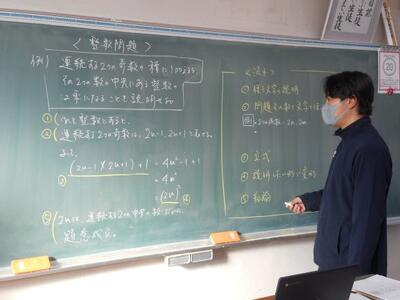 加藤先生のクラスは「整数問題」の入試対策に取り組んでいます。加藤先生が証明の書き方の流れを整理しています。大塚先生も加藤先生も板書が美しいですね~