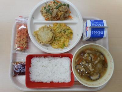 今日の給食は「ごはん・牛乳・野菜のかき揚げ・切干大根のベーコン煮・きのこ汁・原宿ドッグ」です。