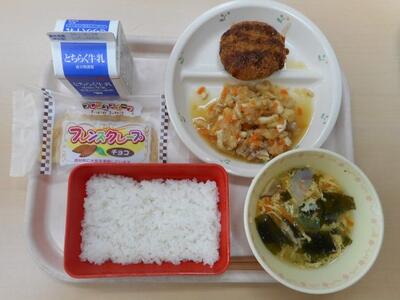 今日の給食は「ごはん・牛乳・メンチカツ・しもつかれ・かきたま汁・フレンズクレープ」です。