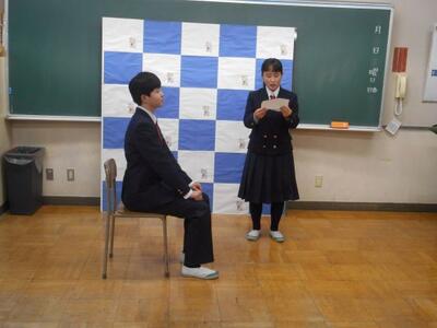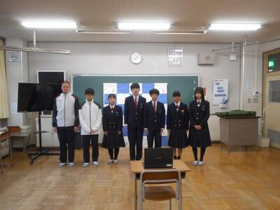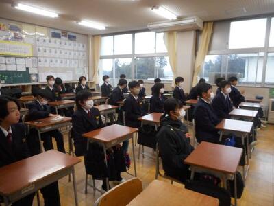 今朝は生徒集会がありました。今回は生徒会執行部が担当です。はじめに3月2日から始まる「マナーアップ週間」についてのお知らせがありました。卒業式に向けて、座っているときの姿勢や起立・礼の仕方、身だしなみ等を確認しました。授業中も授業前後のあいさつでも意識していきます。