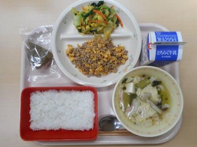 今日の給食は「ごはん・牛乳・二食丼の具(肉そぼろ・炒り卵)・菜の花あえ・ゆばのすまし汁・さくらもち」です。