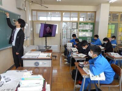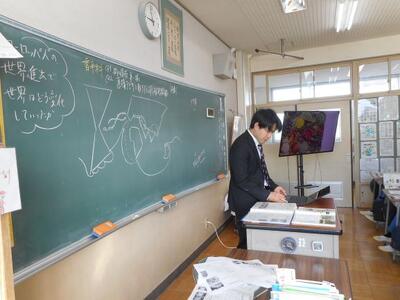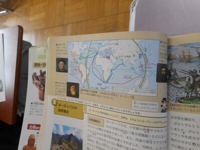 ・1時間目、1年1組は社会です。「ヨーロッパの世界進出で世界はどう変化していったか」を学習しています。大航海時代ですね。コロンブス、バスコダガマ・マゼランの名前がでてきました。