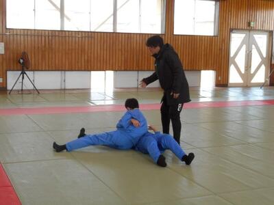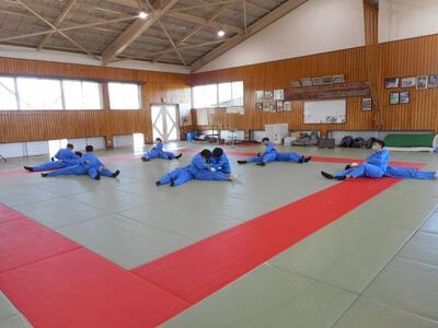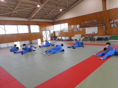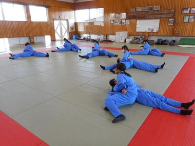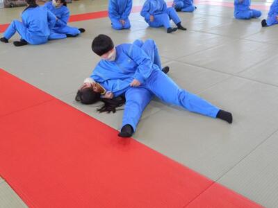 ・3時間目、2年1組は柔道です。数日前から今日の柔道の授業を楽しみにしていた生徒もいます。準備運動の後、昨年度も学習した袈裟固めの練習です。瓦葺先生が注意点を伝えています。体幹が強いことが重要だそうですよ。どんなスポーツもやはり体幹が大切なんですね。